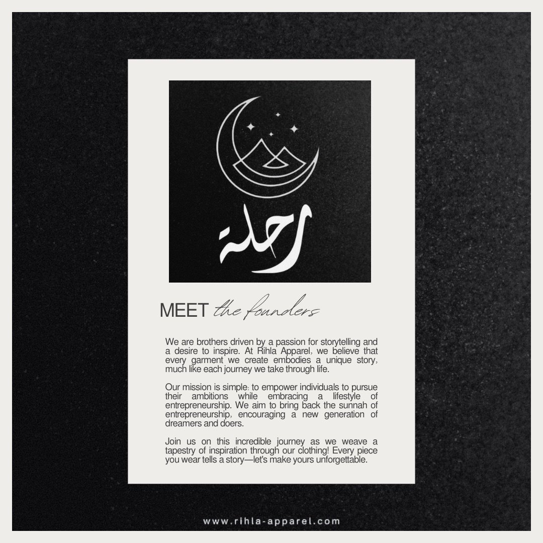 Welcome to Rihla Apparel, where every piece tells a story and every garment marks a journey. Derived from the Arabic word for "journey," Rihla embodies the spirit of exploration, self-discovery, and the unique paths each individual travels in life. Our mission is to create high-quality hoodies that not only provide comfort and style but also inspire wearers to embrace their own journeys with confidence and authenticity.